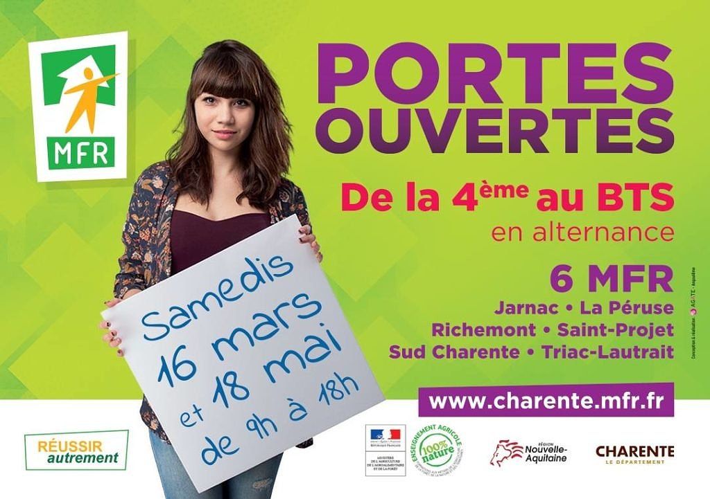 PORTES OUVERTES DES MFR DE CHARENTE Samedi 30 avril 2016 de 9h à 18h Les MFR de Jarnac, La Péruse, Saint Projet, Sud-Charente et Triac-Lautrait vous ouvrent leurs portes. C’est l’occasion de…
